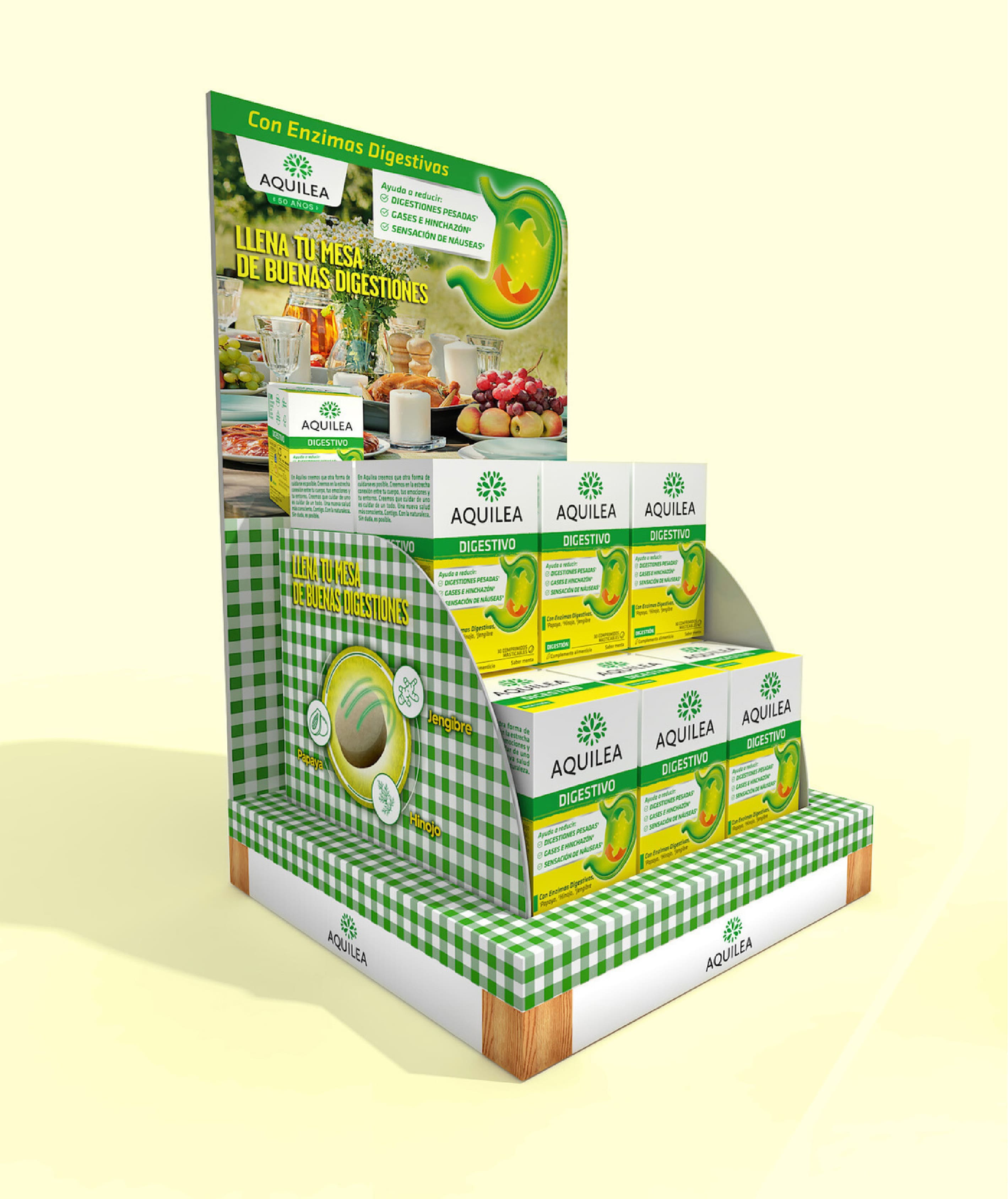 En este proyecto, la misión era clara: diseñar una pieza funcional, compacta y visualmente fresca para comunicar los beneficios de la línea digestiva de Aquilea en el punto de venta. Desde Tromo creamos un expositor que combina organización eficiente con un lenguaje visual cercano y natural, alineado con el enfoque saludable de la marca.