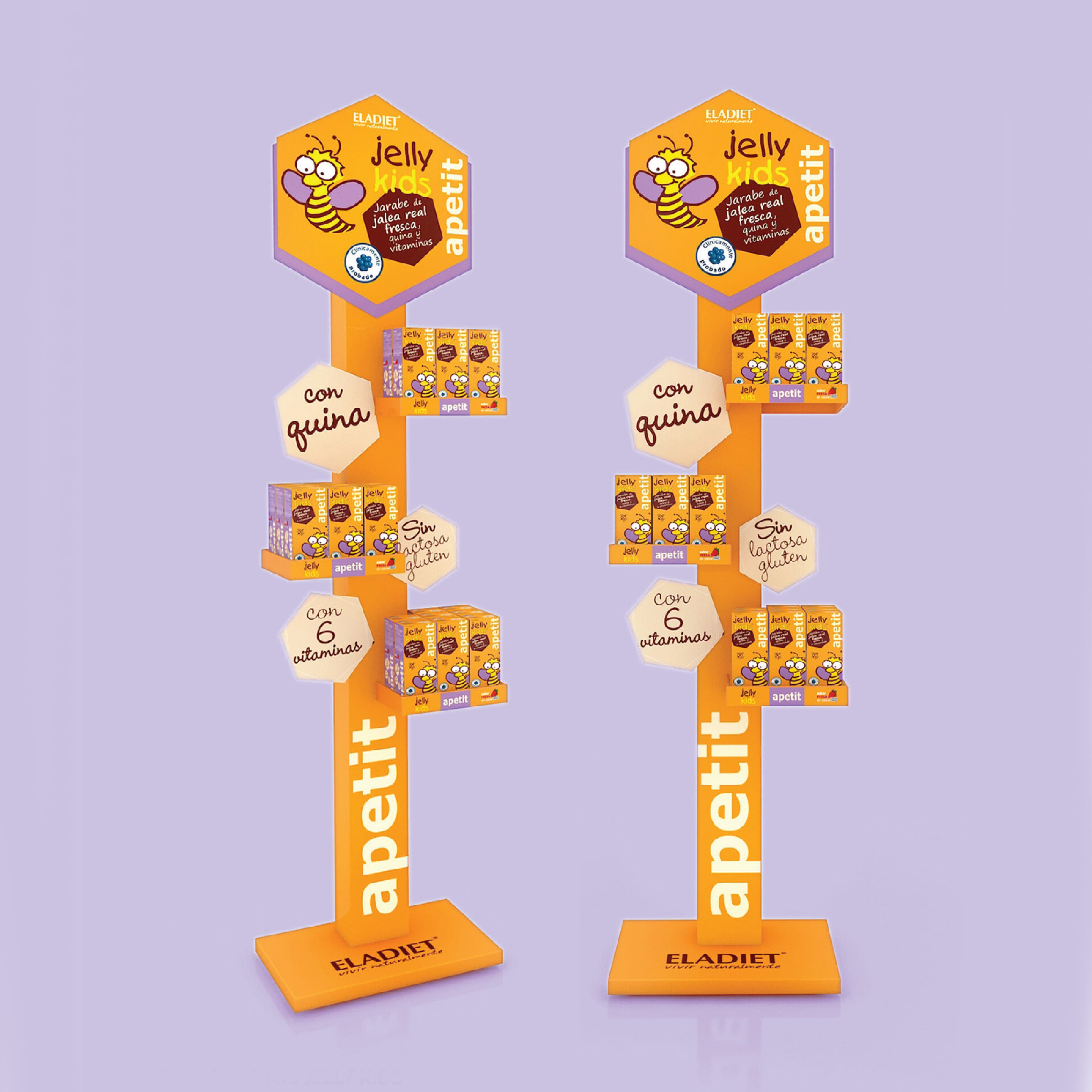 En colaboración con Jelly Kids, desarrollamos un floorstand vibrante y lleno de personalidad para presentar su línea Appetit, un jarabe infantil a base de jalea real, quinoa y vitaminas. El reto: diseñar un expositor que fuese visualmente llamativo, fácilmente reconocible por padres y niños, y que transmitiera los valores clave del producto: salud, alegría y confianza.